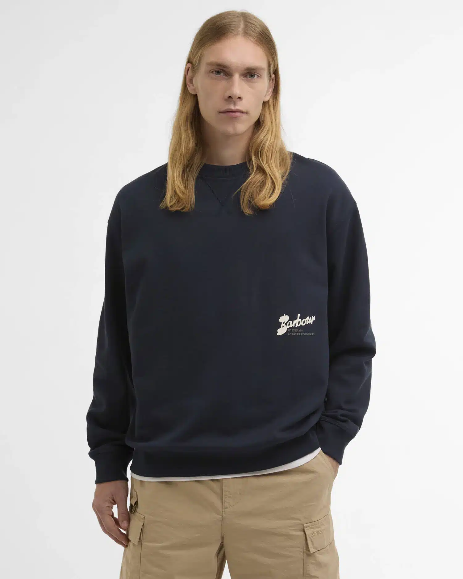 Embrace ultimate comfort with the Barbour Blythe Crewneck Jumper, your new favourite for relaxed days. This oversized sweatshirt is crafted from 100% soft cotton and features classic details like cover stitch seams and a V-insert at the neck. A subtle graphic adorns the chest, while a large, bold Barbour print and embroidery make a statement on the back.