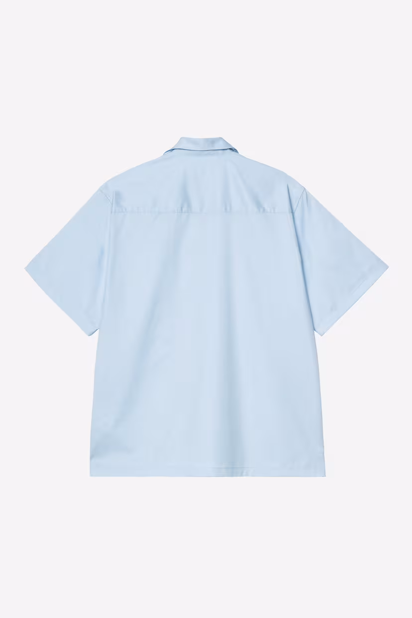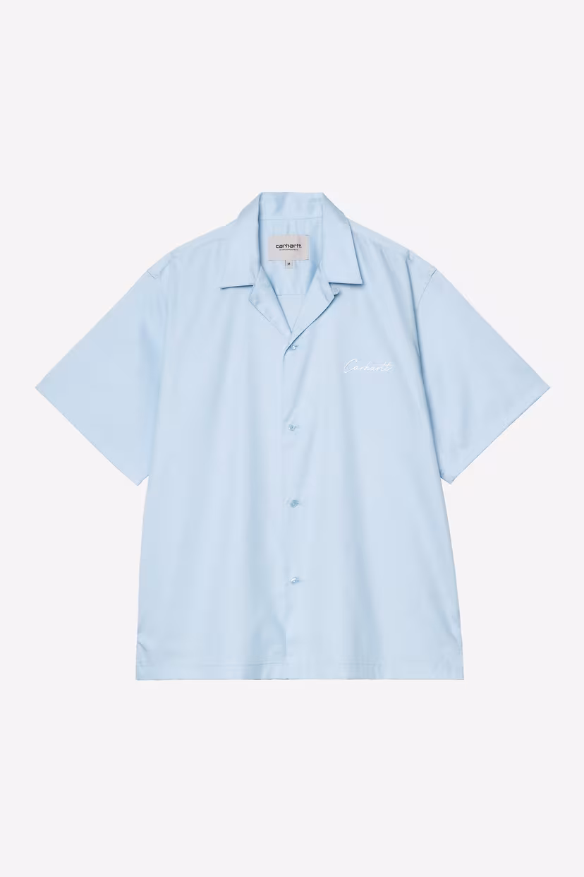 The S/S Delray Shirt is made from a lightweight lyocell-cotton twill. It also has a camp collar and buttoned front. Logo embroidery appears on the left chest.