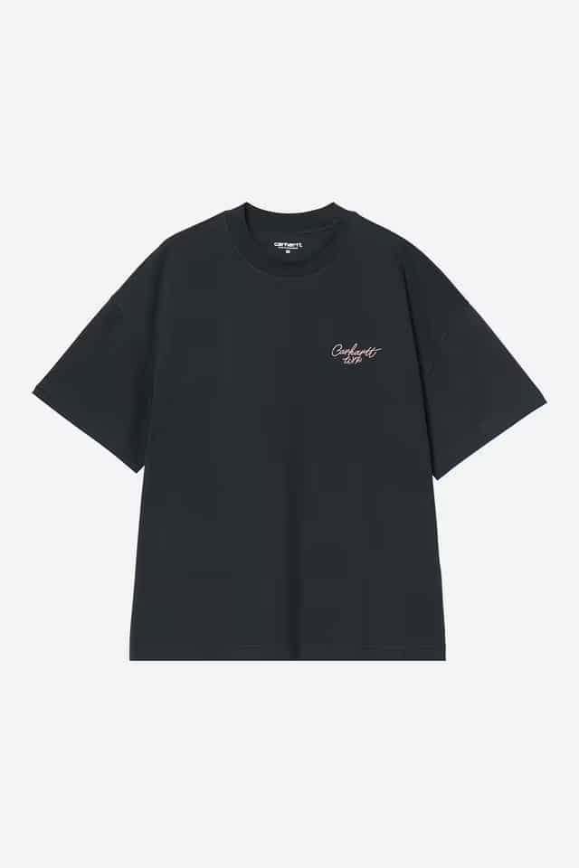The S/S Signature Script T-Shirt is woven from midweight organic cotton jersey in a boxy loose fit. Graphic embroidery appears on the chest.