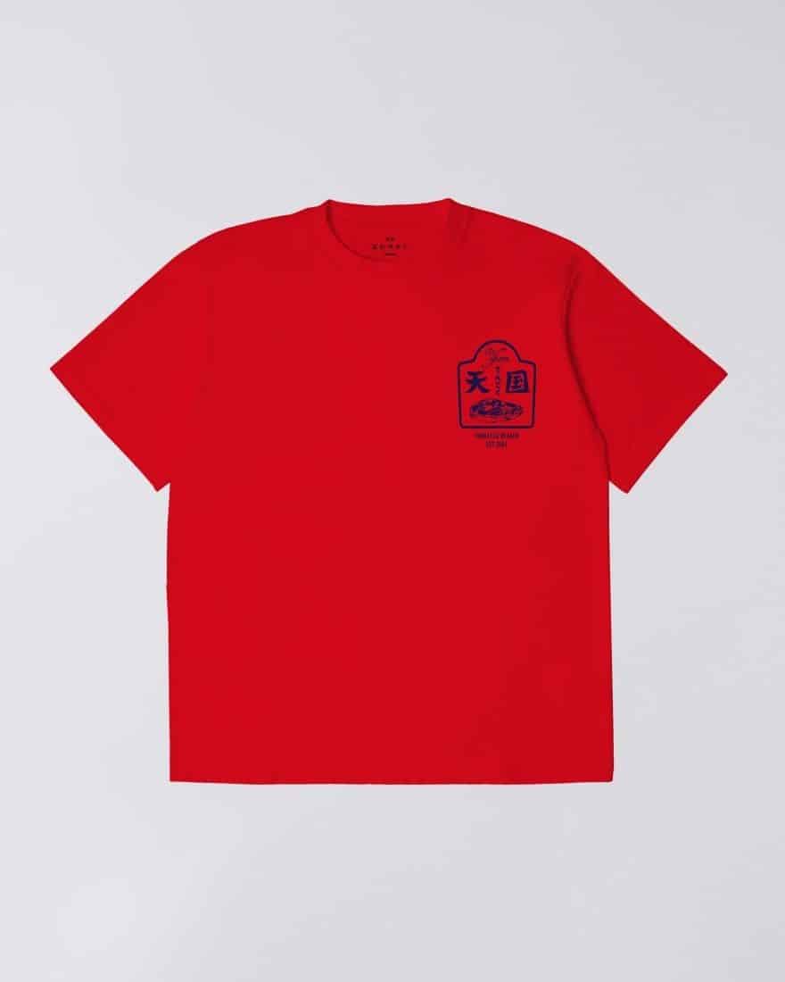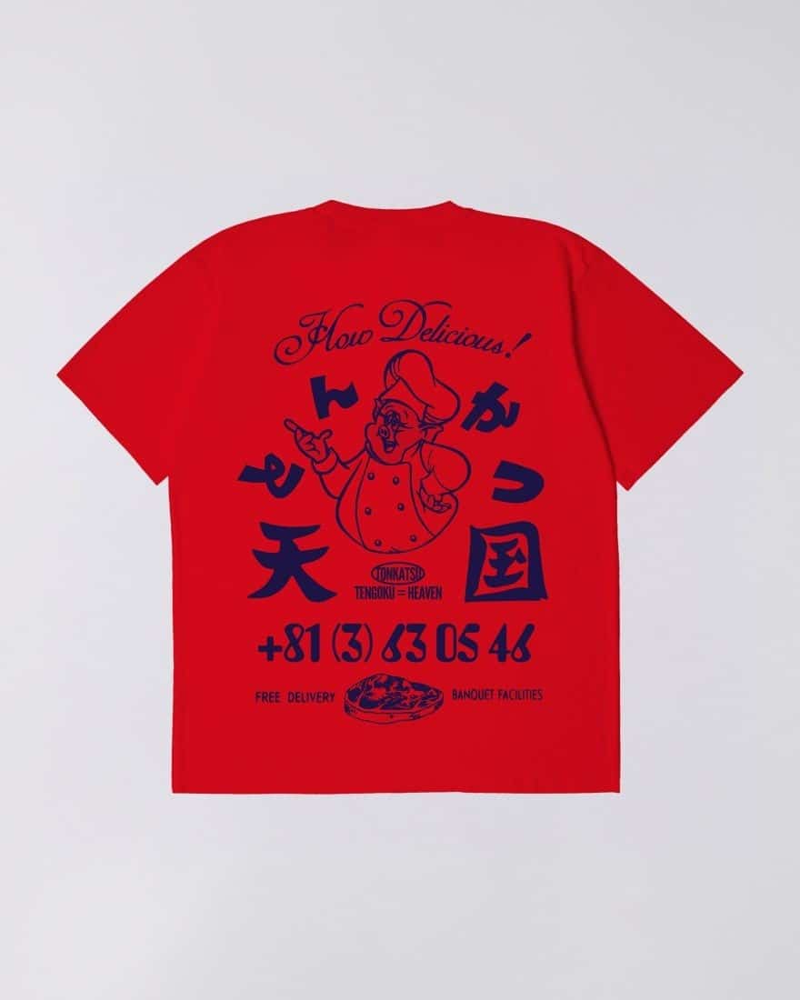 The EDWIN Tonkatsu T-Shirt is made from 160g/m² single jersey, 100% cotton. It features an oversized fit, graphic prints on both chest and back, and a ribbed collar for added durability and structure.