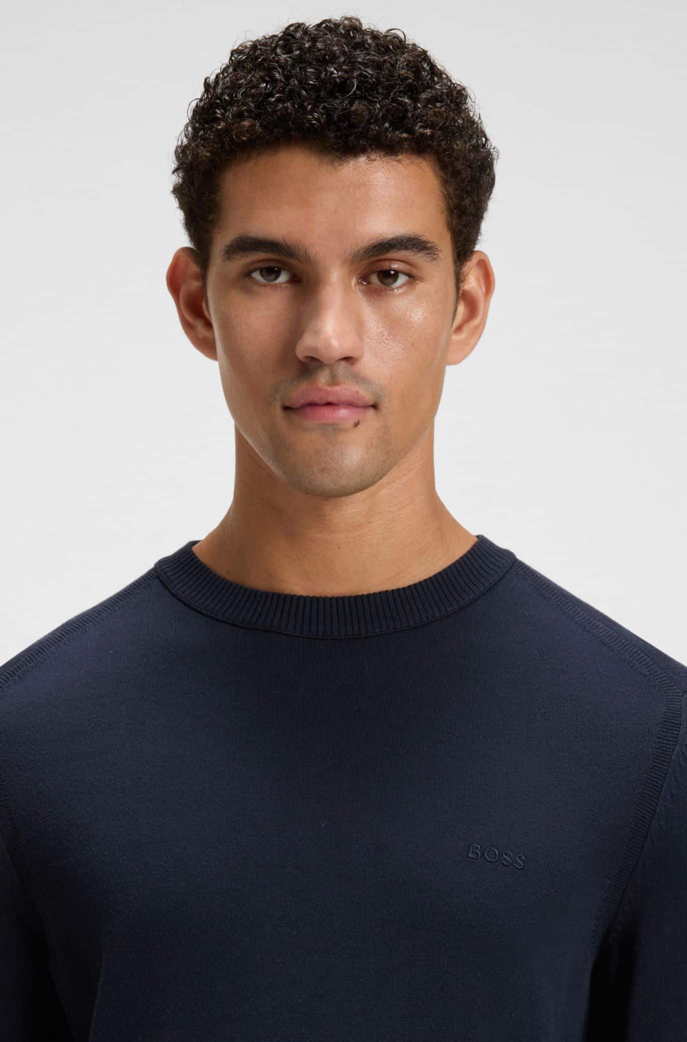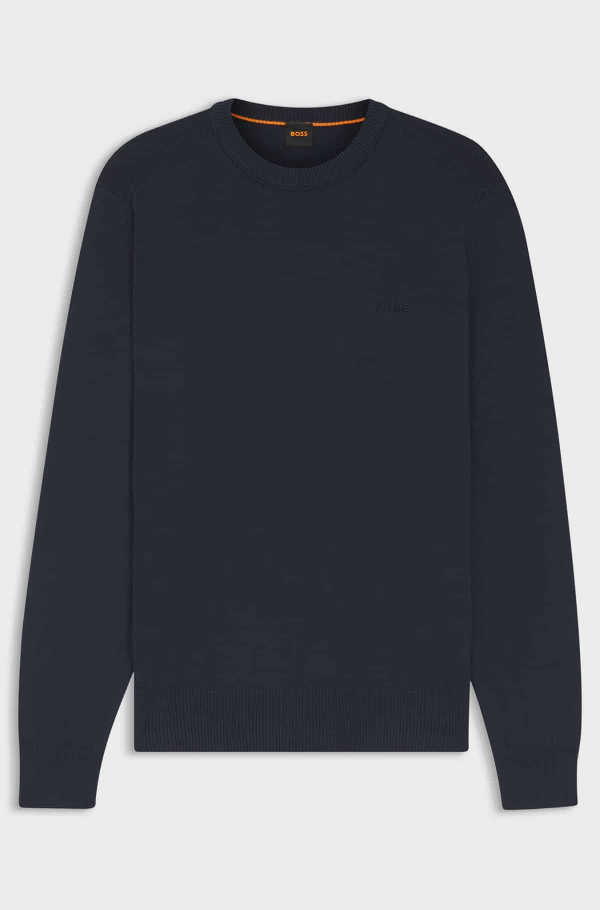 Upgrade your knitwear with the soft cotton, embroidered logo and shoulder detailing of this BOSS Menswear sweater. Cut to an easy regular fit. This product contains at least 80% better raw materials. This product is partly made with organic cotton. Our organic standards do not allow the use of synthetic fertiliser, pesticides or genetically modified seeds.