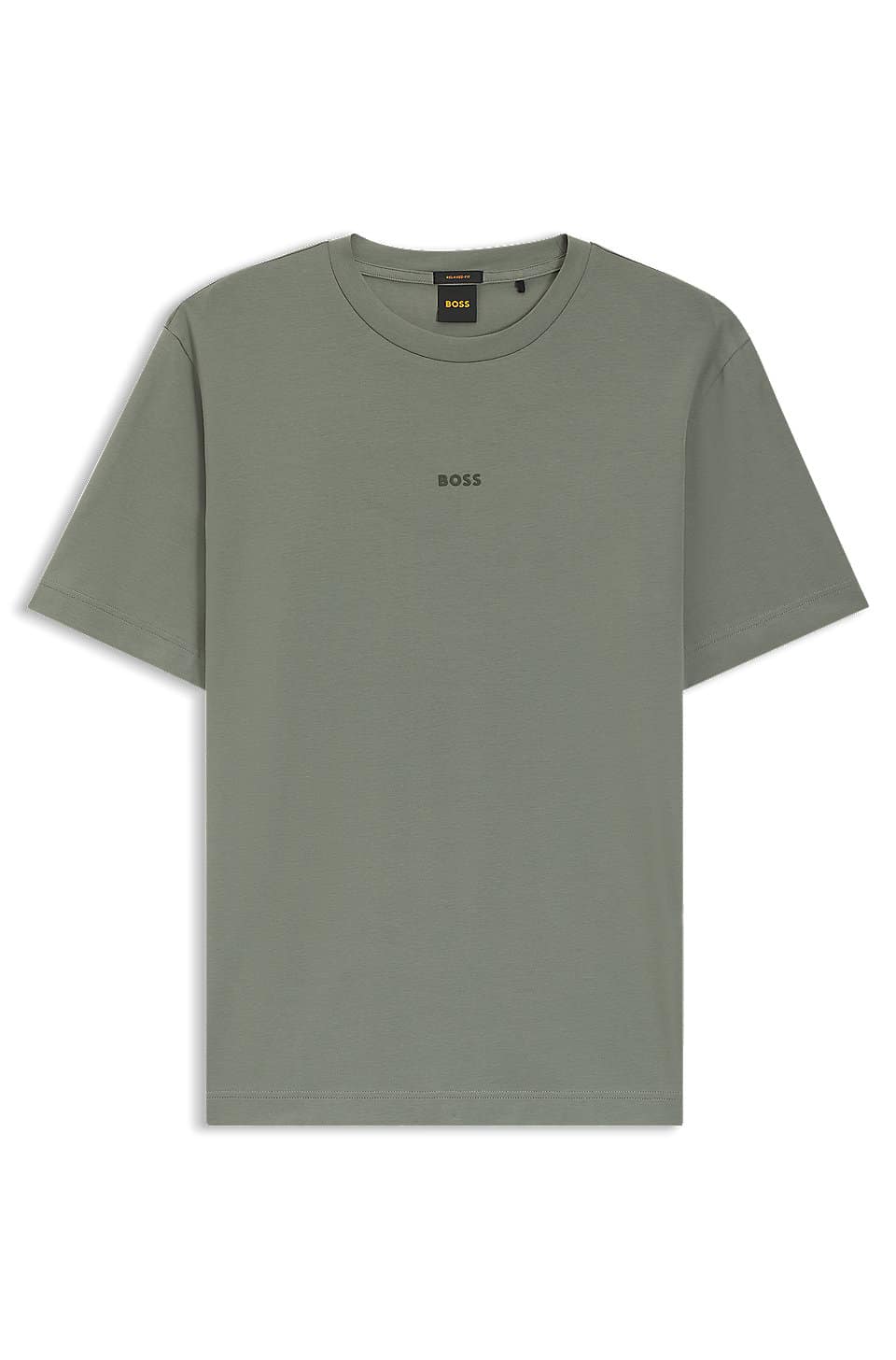 In cotton with added stretch for comfort, this BOSS Menswear T-shirt is printed with a centre-front contrast logo. Laid-back fit.