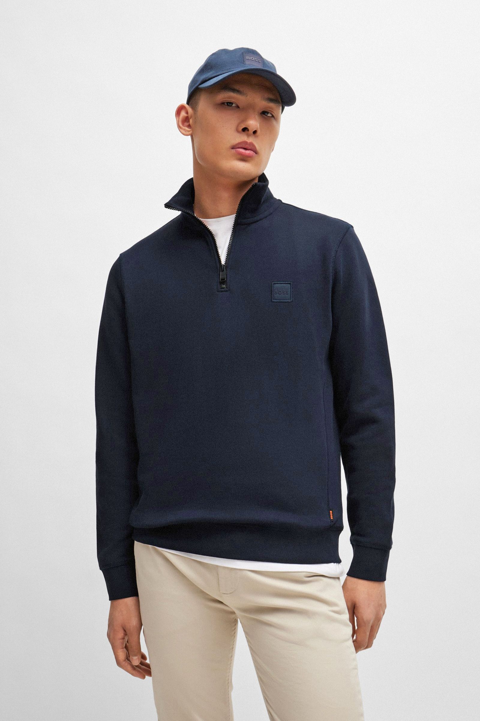 Trimmed with a logo patch, this BOSS Menswear sweatshirt has a quarter zip for classic layering. Crafted in soft French-terry cotton. Regular fit.