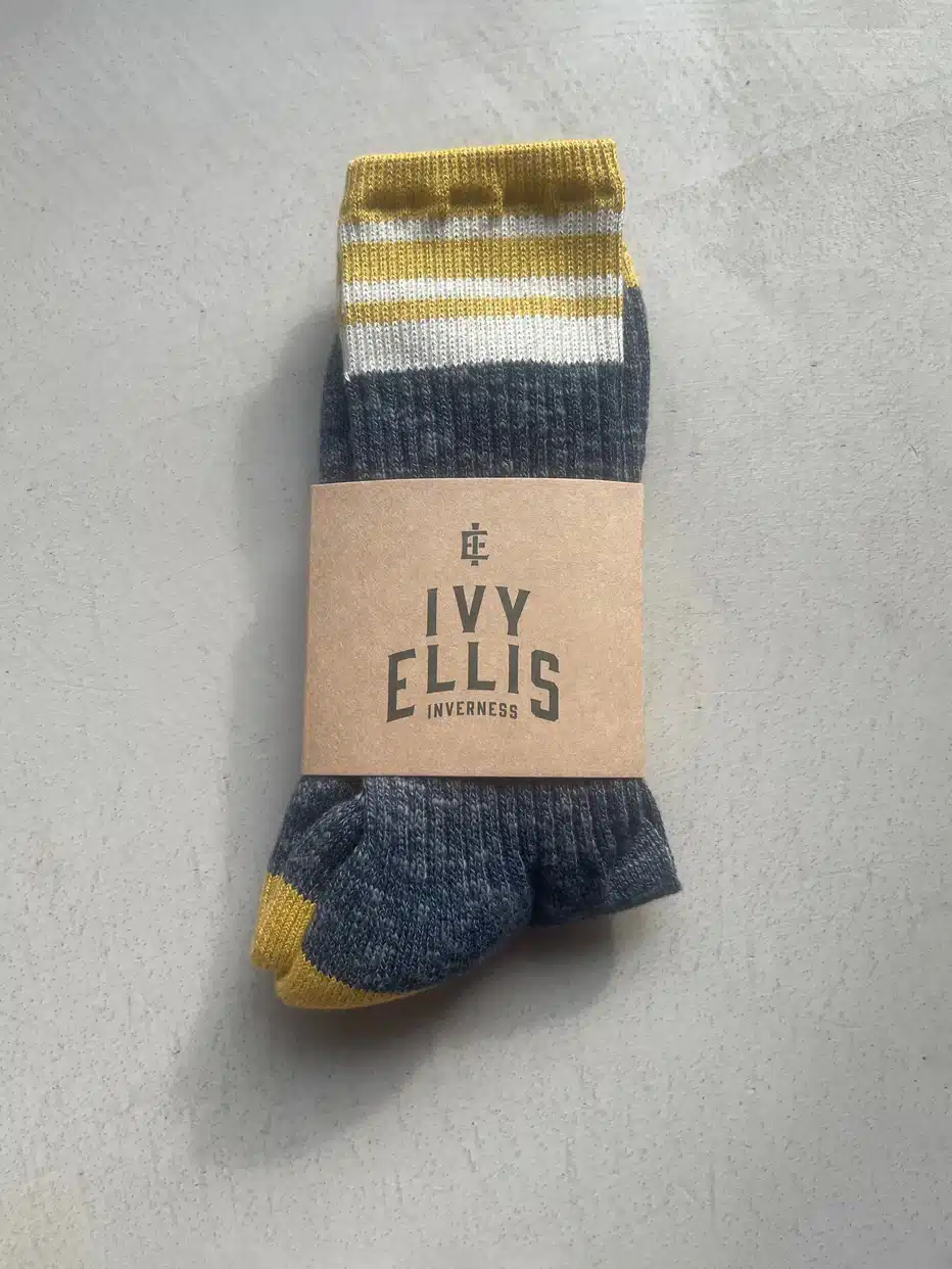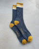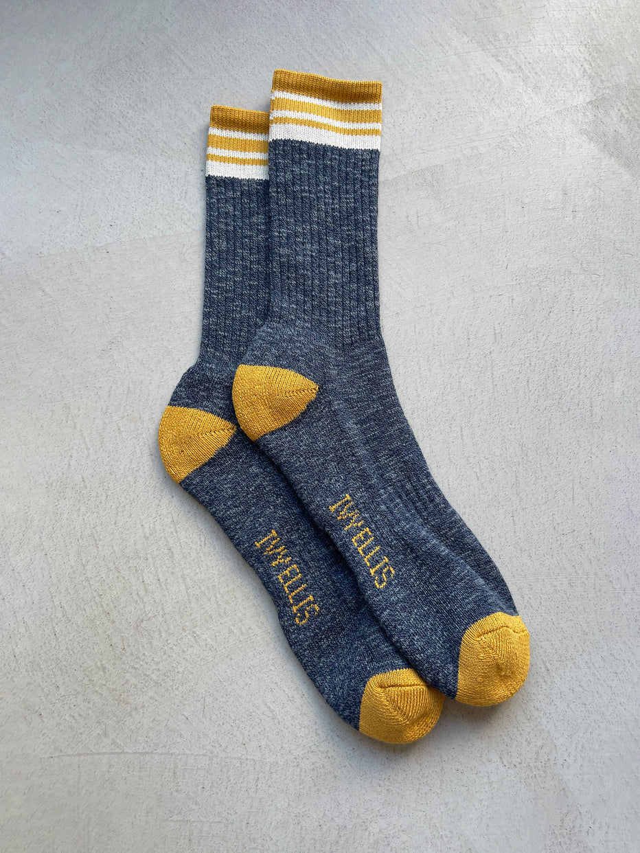 Crafted in textured slub cotton yarn, this style pairs a deep blue marl body with mustard heel, toe, and striped cuff detail—bringing warmth and vintage character to a versatile everyday sock.