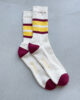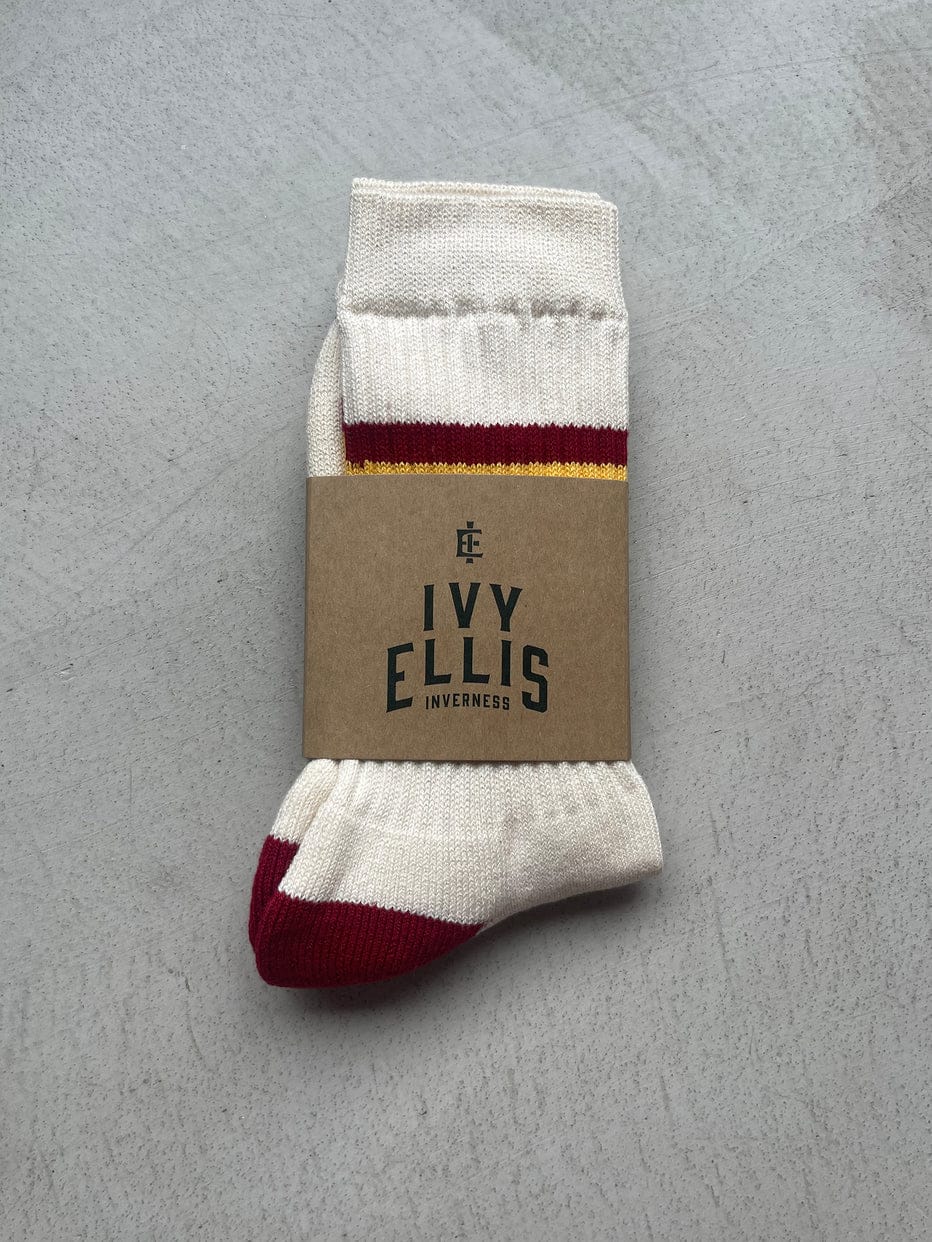 A bold tribute to Canadian ice hockey icon Lanny McDonald, The Lanny socks bring a retro athletic energy to everyday style. Featuring a vintage cream base, red toe and heel, and striking red and yellow striped top, these crew-length socks evoke the spirit of 1970s sportswear.