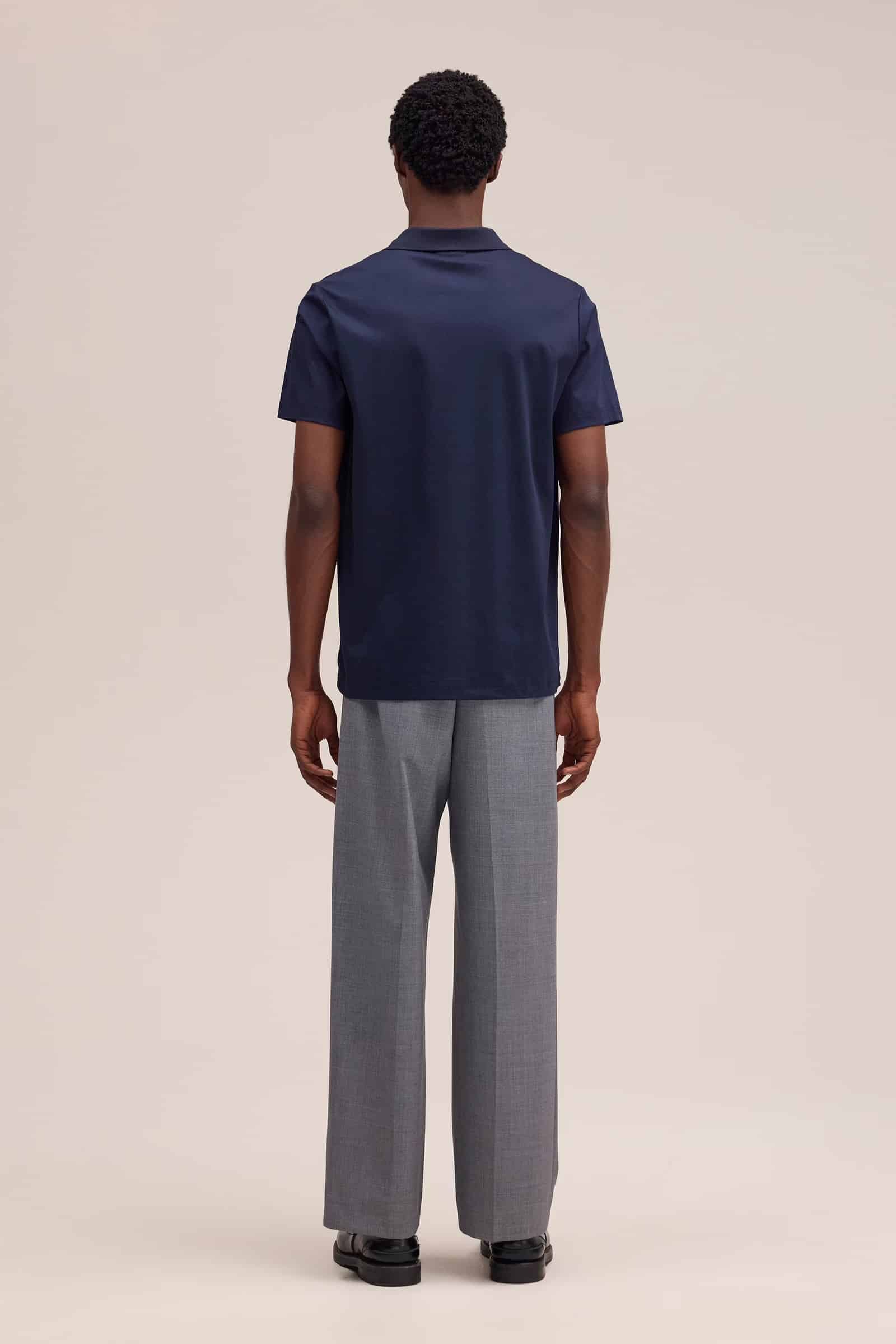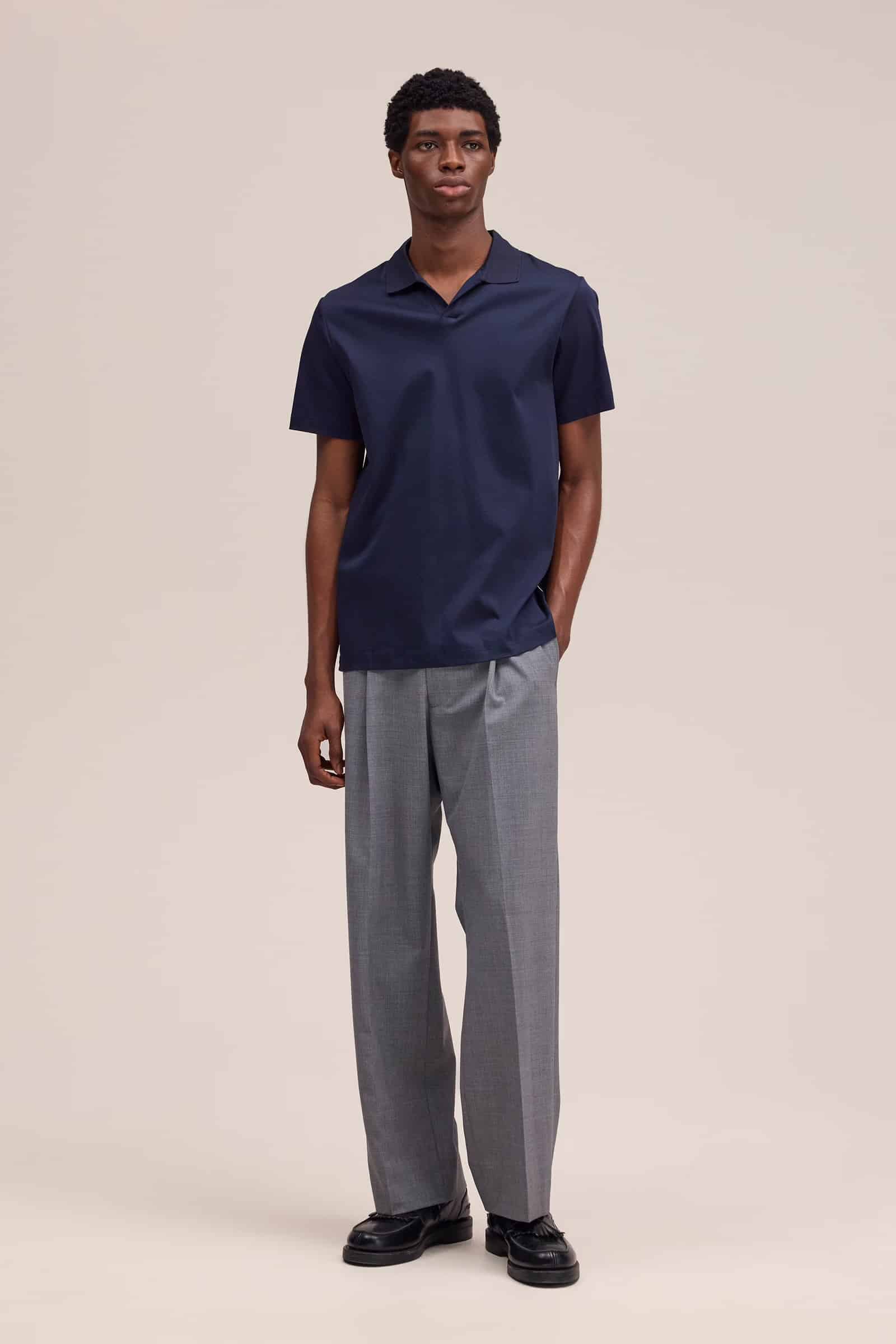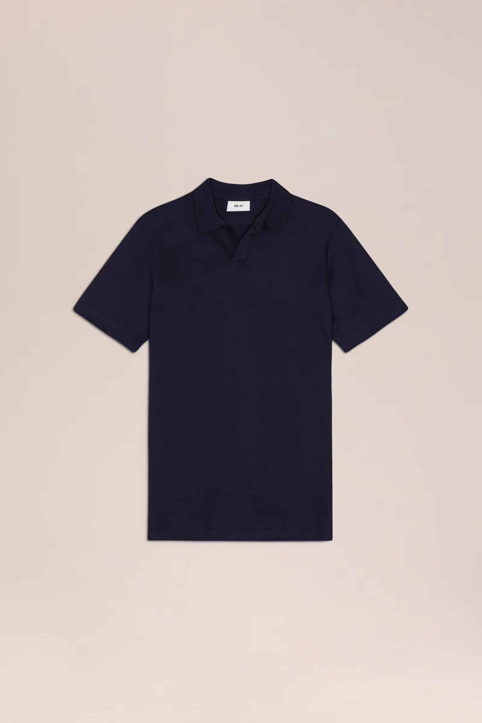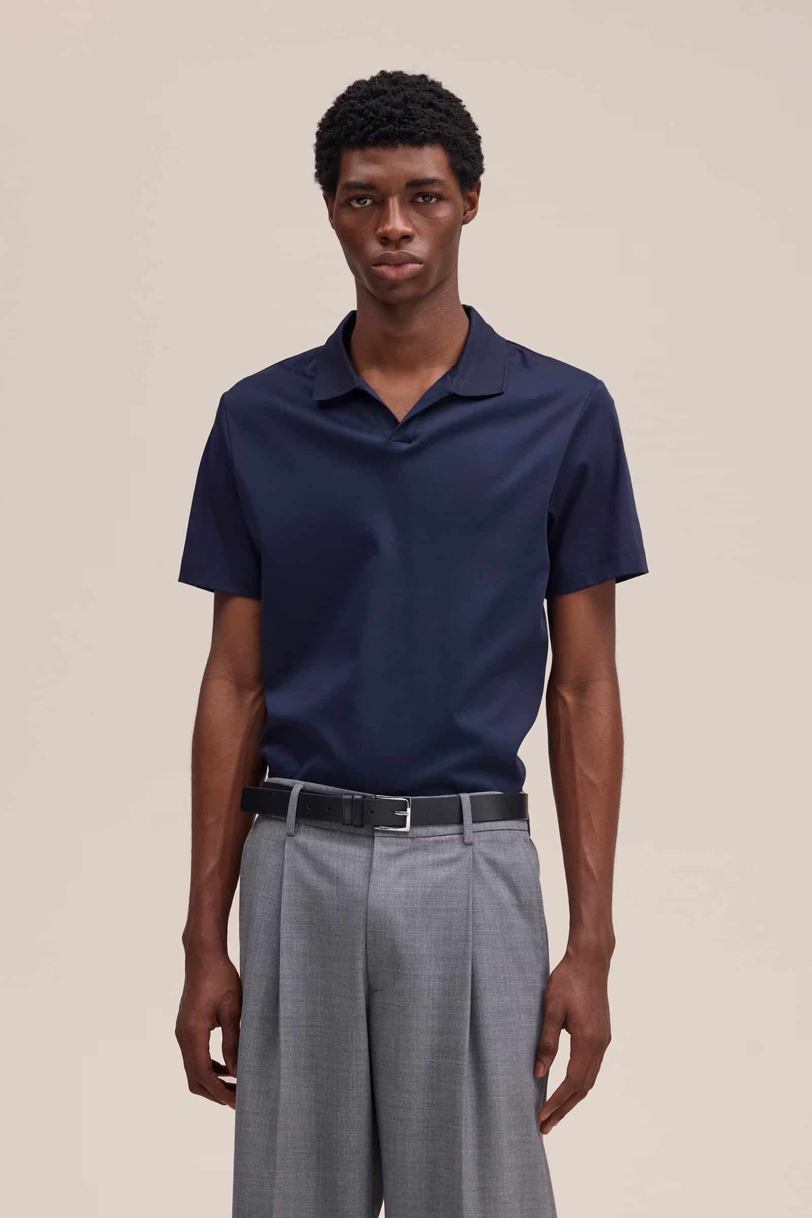 Open-collar polo crafted in smooth organic cotton interlock jersey with a soft, luxurious handfeel. Finished with a flat knitted collar and twin-needle stitching.