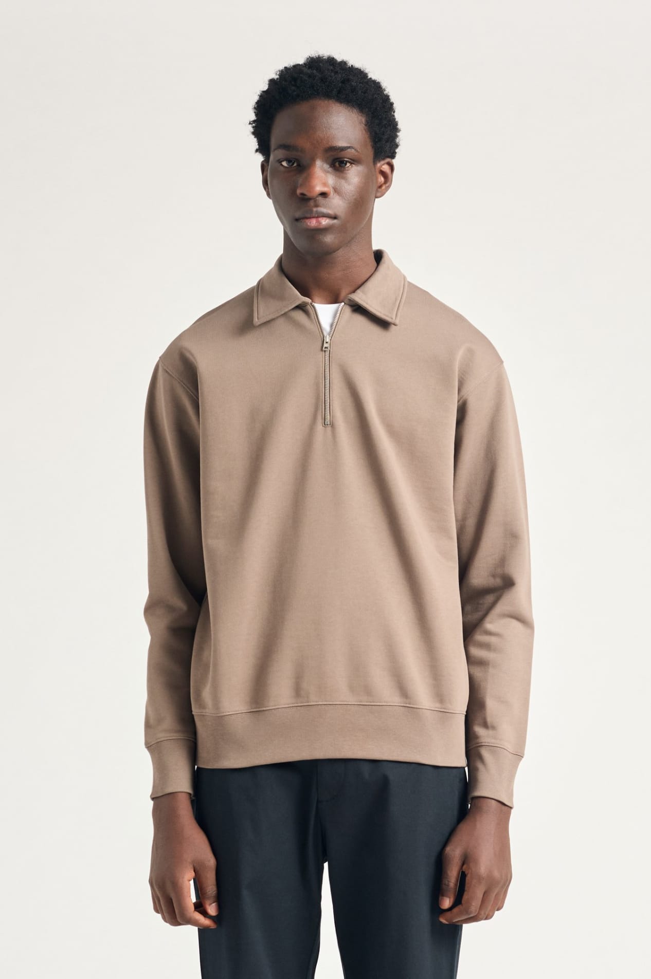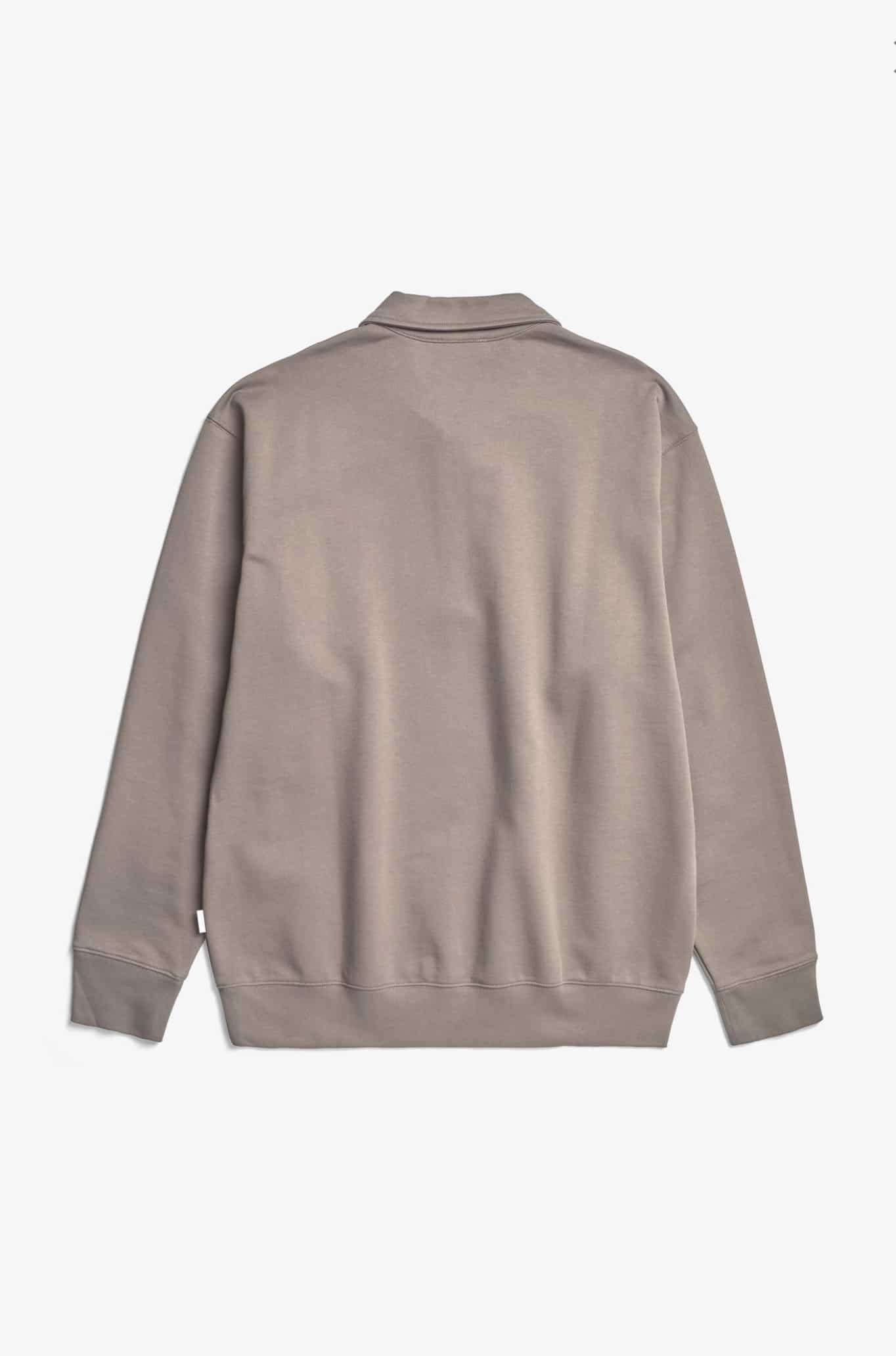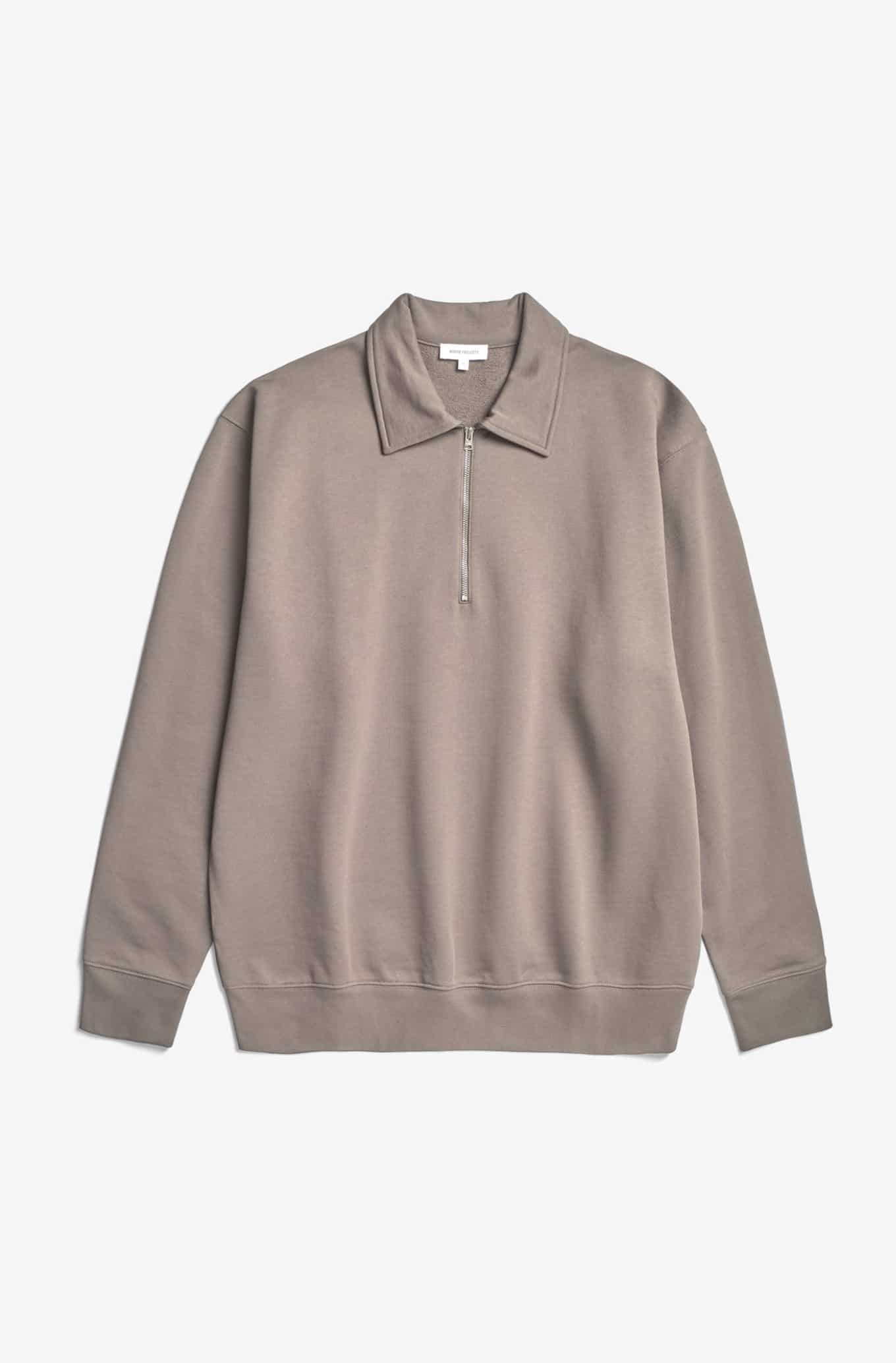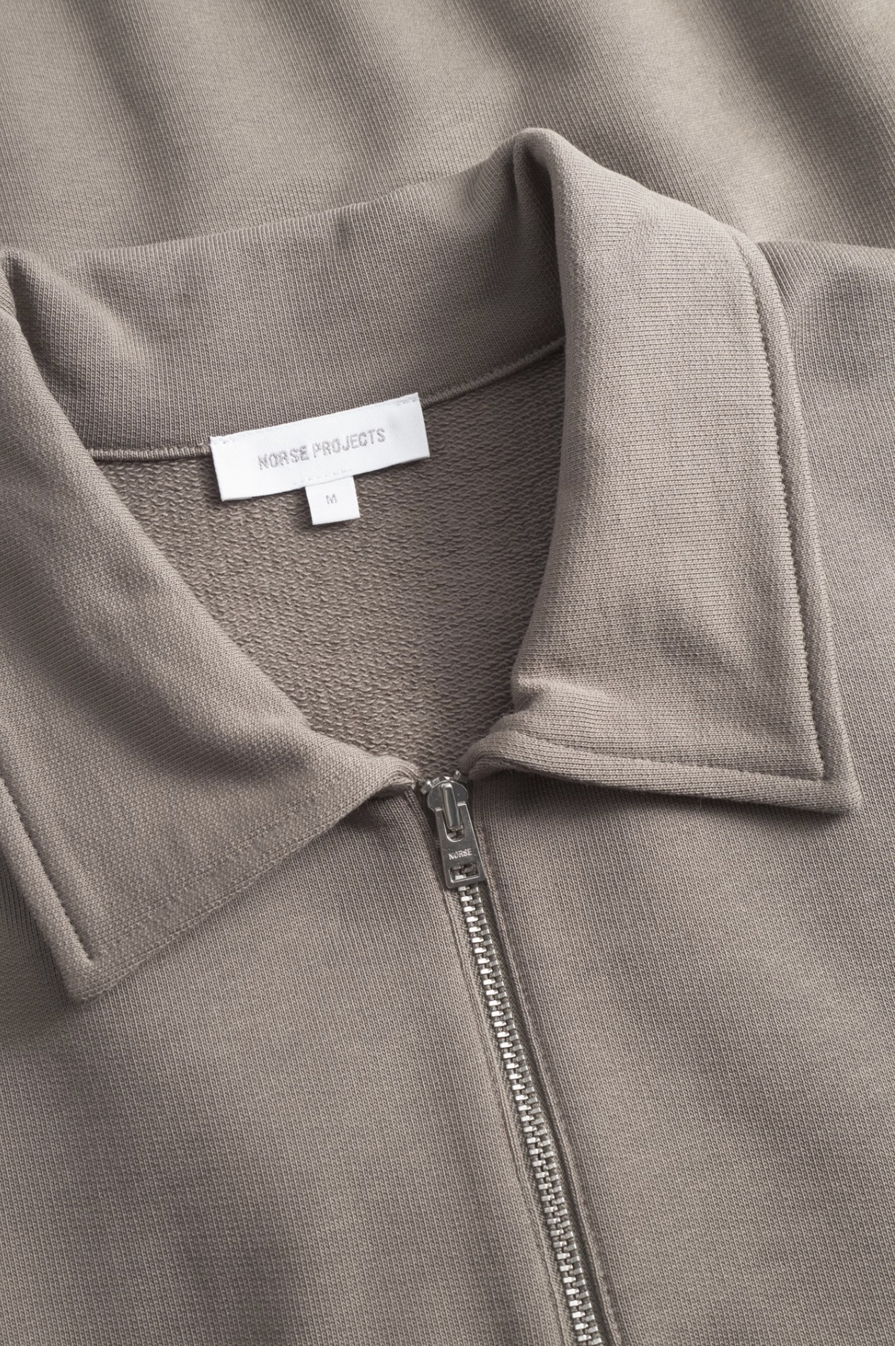 The Norse Standard Half Zip Sweatshirt is made from midweight organic cotton loopback terry, offering a regular fit. It features set-in sleeves, branded metal zipper, ribbed collar, cuffs, and hem and branded tab at the side seam.