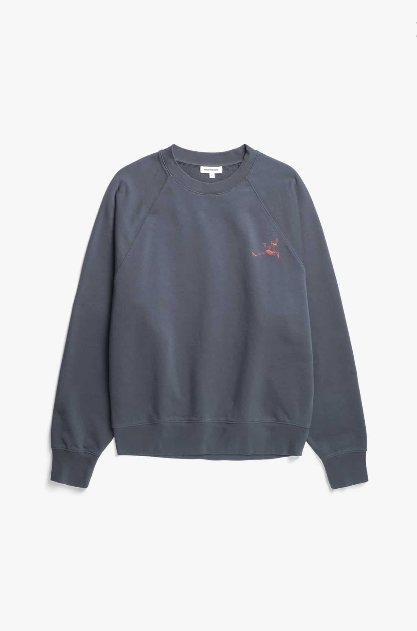 Norse Projects x Daniel Frost. A relaxed and boxy fitting crewneck sweatshirt with raglan sleeves and cut in a midweight organic loopback cotton fleece. It features an embroidered artwork on the chest, screen printed artwork on the back, ribbed collar and finished with twin needle stitched hem and cuffs.