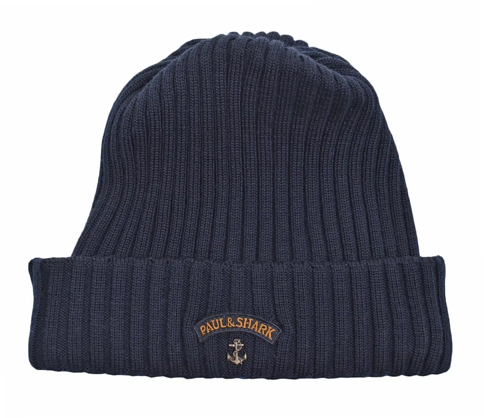 Paul & Shark anchor beanie in black with branding on the front fold and a ribbed style. An iconic beanie, ideal for the colder months to stay warm.