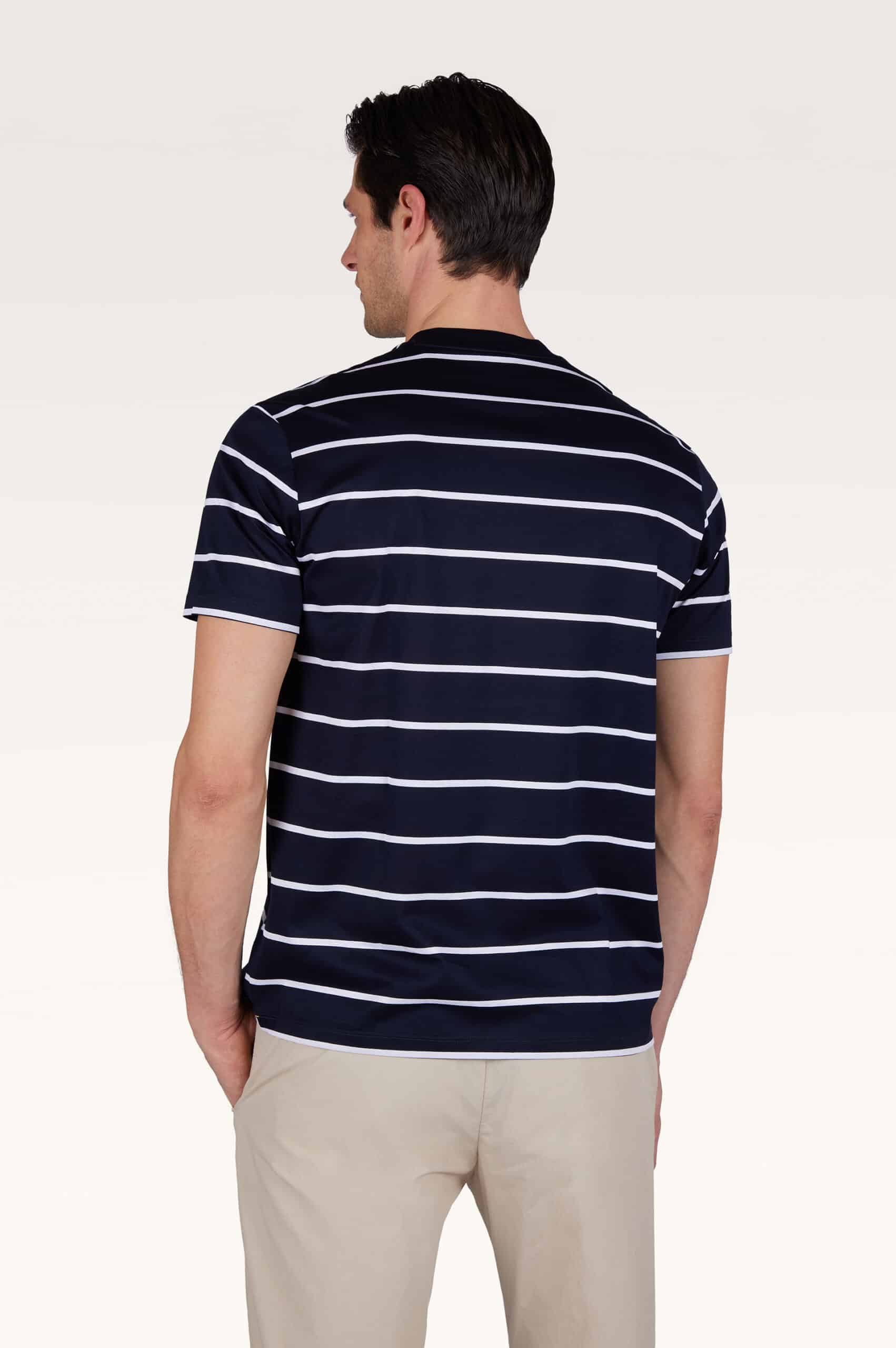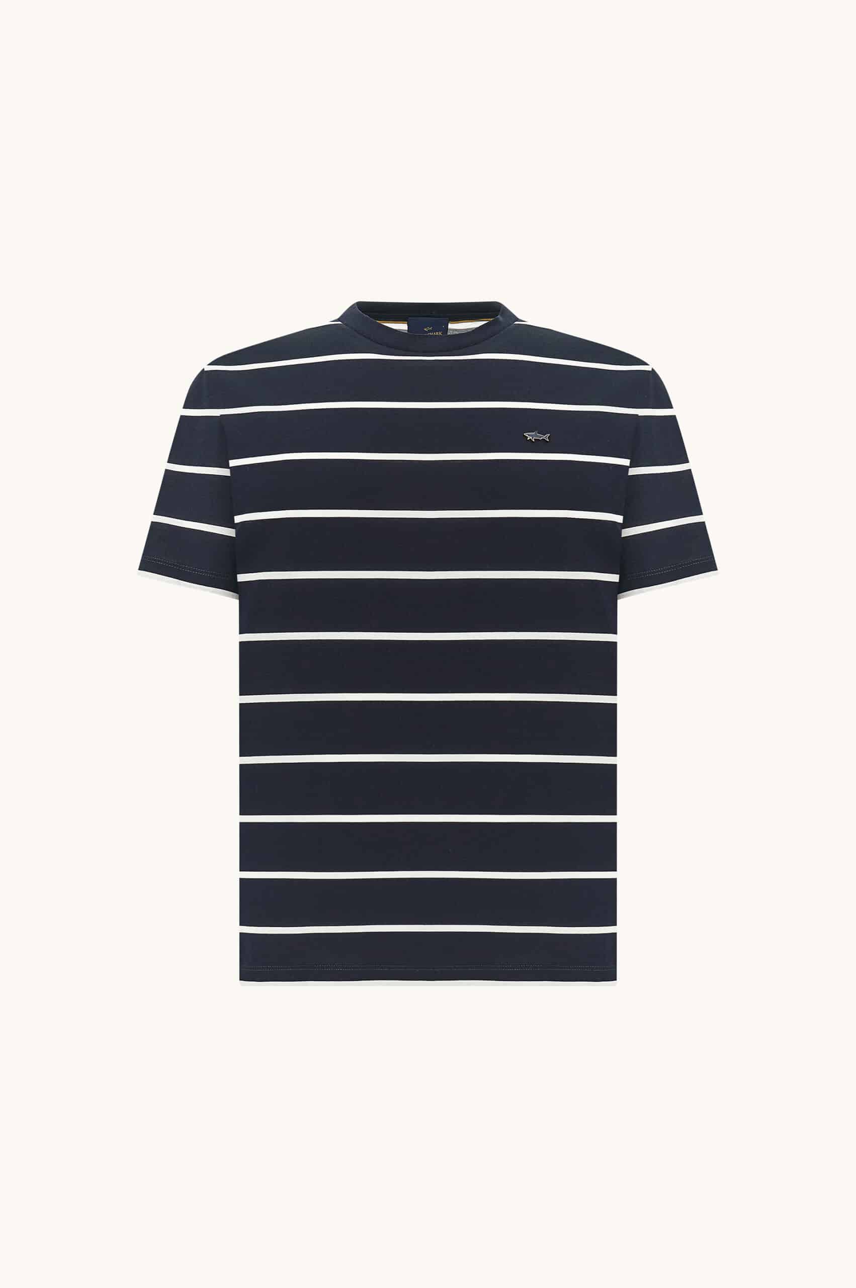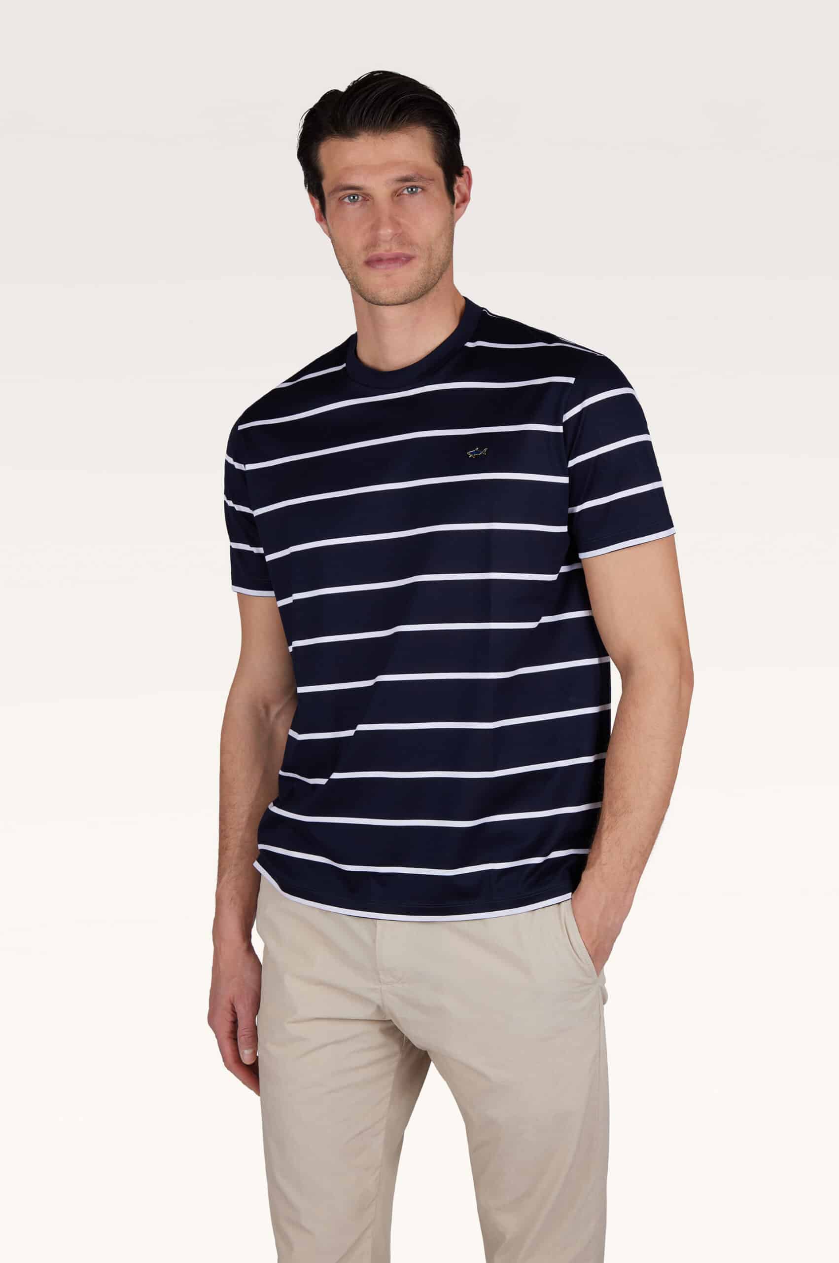 This Breton striped T-shirt embodies the marine heritage of Paul & Shark, constantly evolving to suit modern tastes. Its timeless, laid-back silhouette features a crew neck, short sleeves and our signature metal shark on the chest for a distinctive touch. Crafted from double-faced mercerised cotton jersey that feels naturally lightweight and ultra-breathable against the skin.