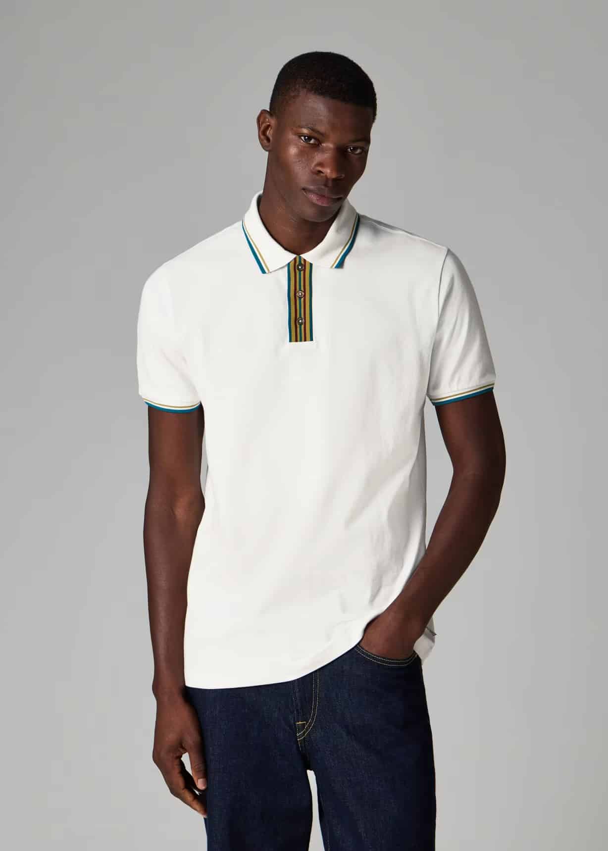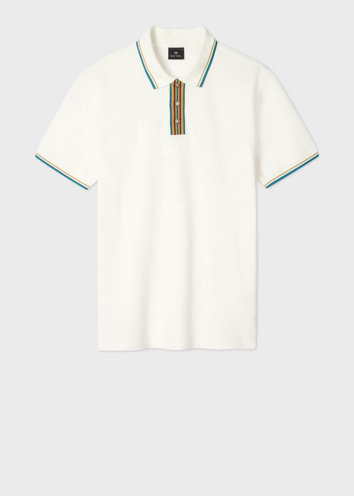 Made from an organically grown cotton with stretch for comfort, this ecru polo features contrast stripe tipping on the placket, collar and cuffs.