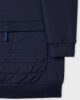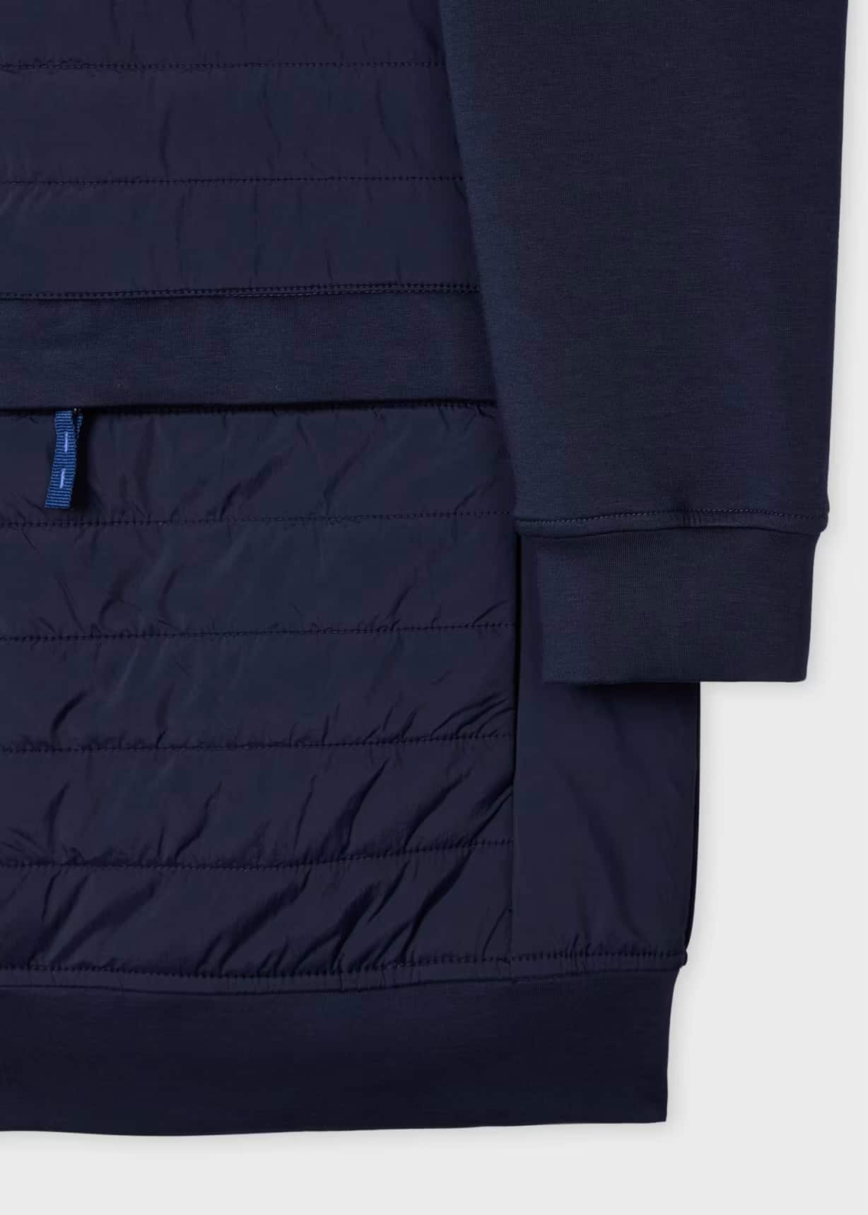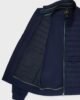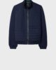 Made from recycled nylon, this navy jacket features a mixed media construction. Using a lightweight quilted front with insulated recycled wadding for warmth, the sleeves and back use a jersey construction allowing for added stretch and comfort. Finished with a ‘Sports Stripe’ zip fastening for a signature pop of colour.