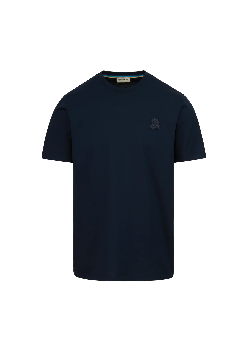 Sandbanks men’s badge logo t-shirt in navy, made from mercerised cotton for a silky and luxurious feel. This classic fitting crew neck t-shirt features an embroidered badge logo on the chest and tri-colour back neck binding.