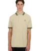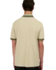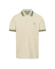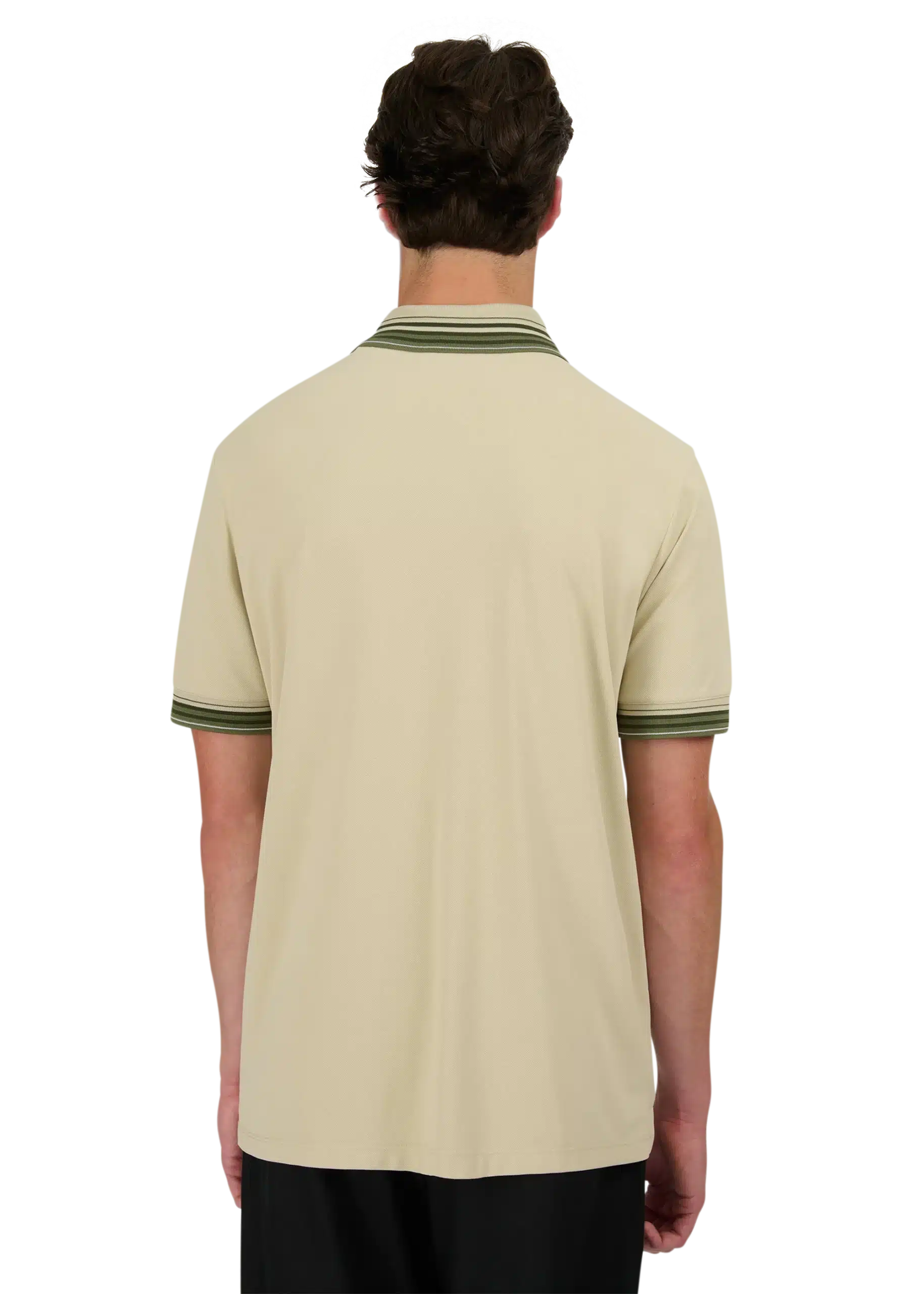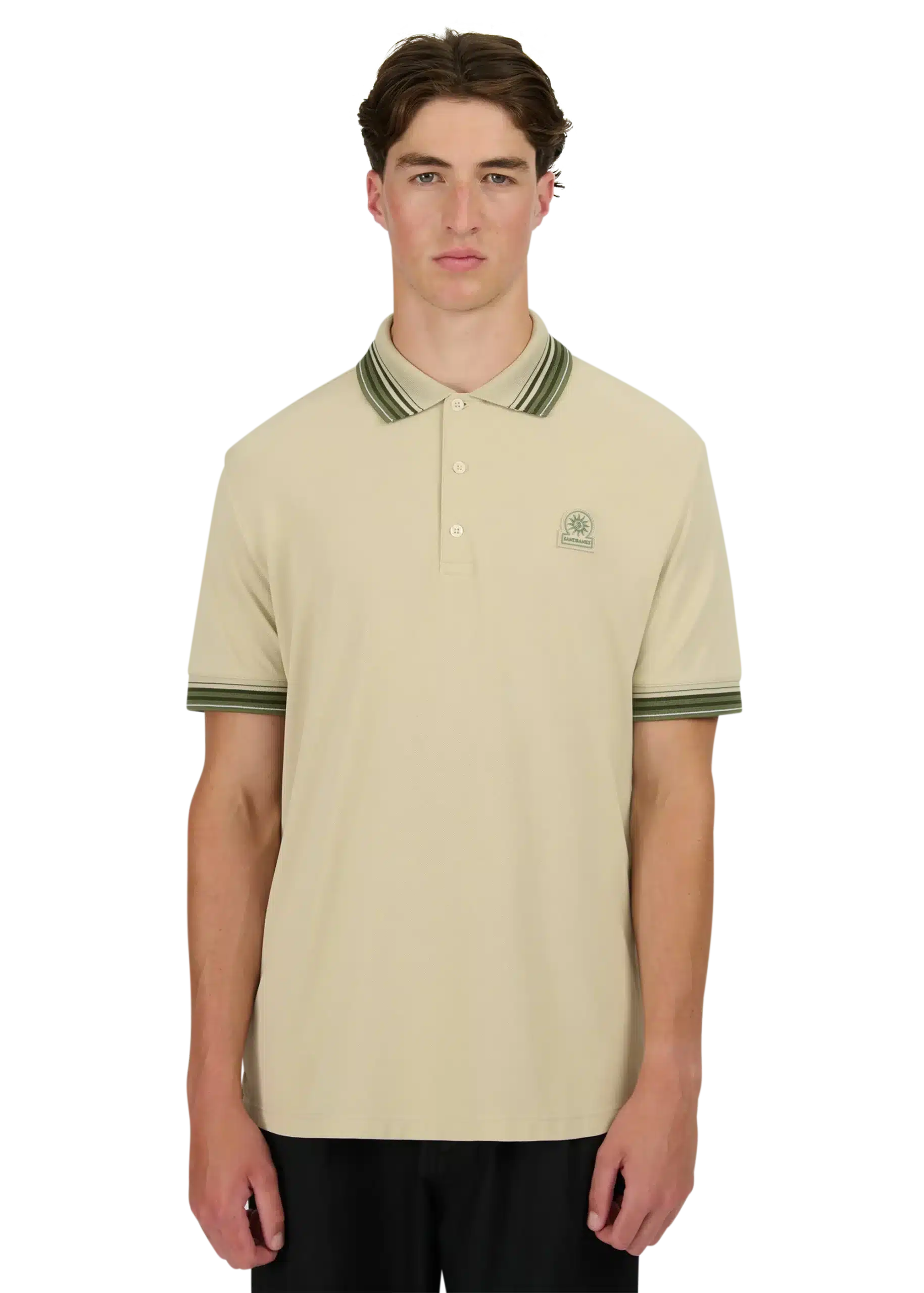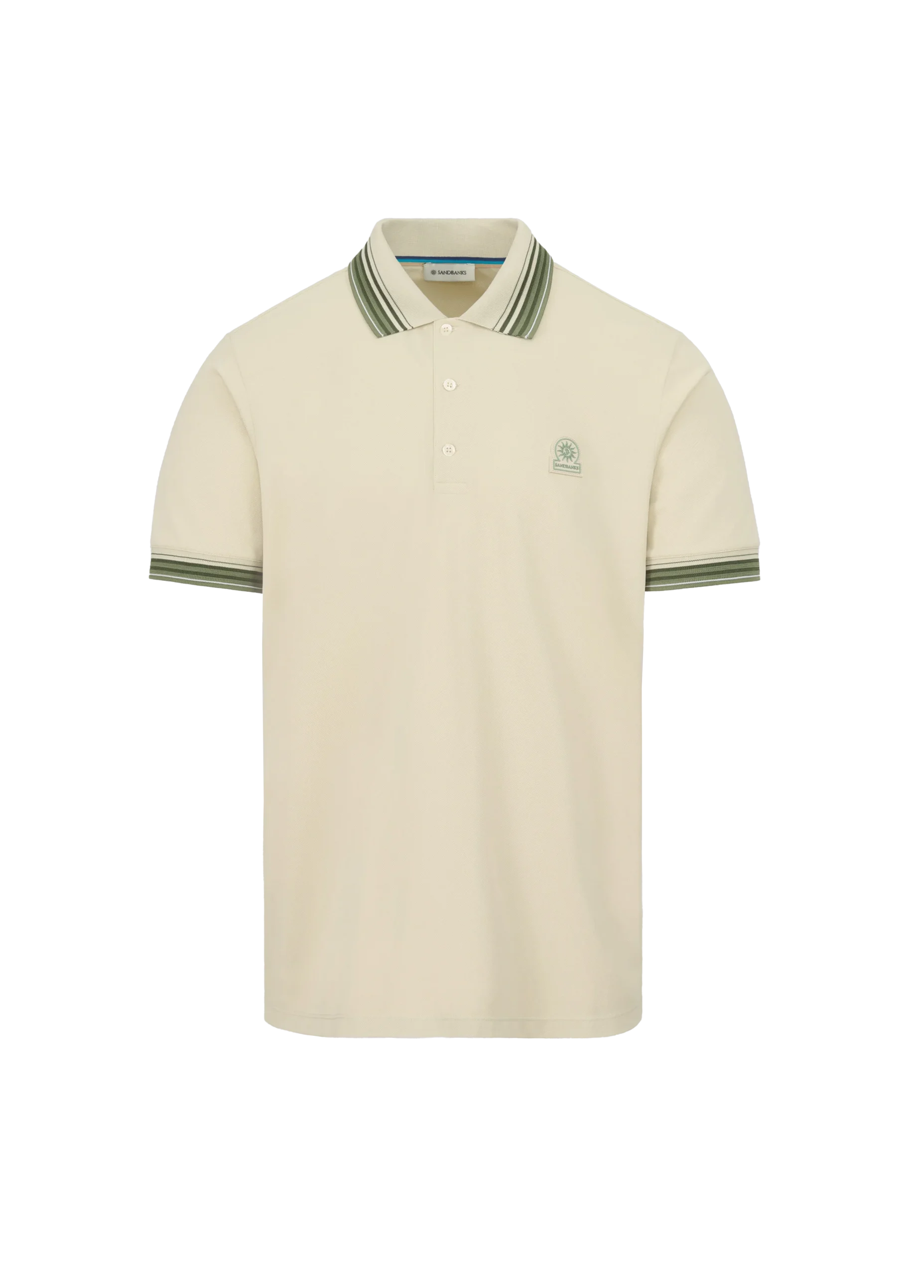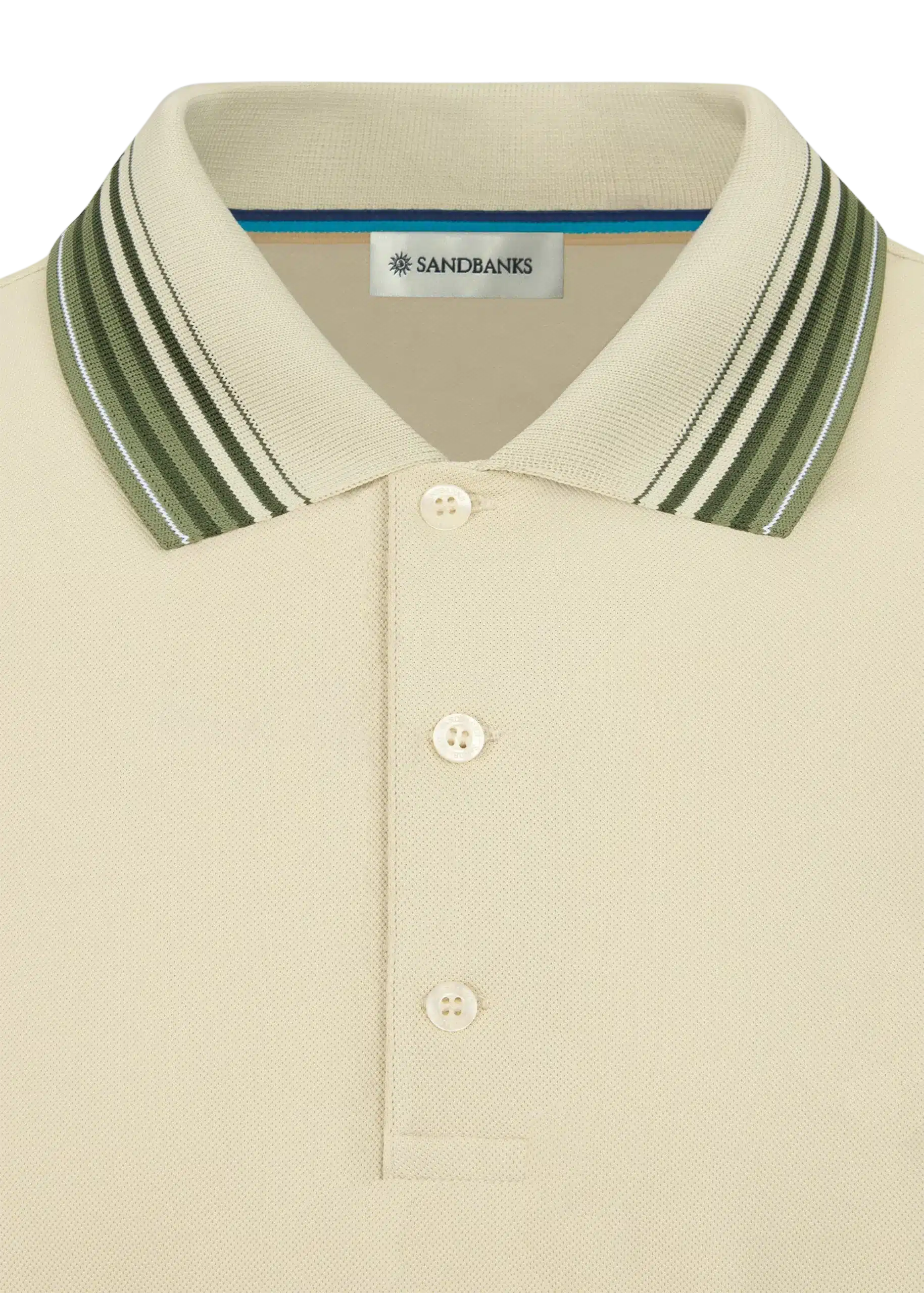 The Sandbanks Gradient Rib Polo Shirt in Stone is crafted from a polyamide micro pique material, providing a sporty texture. It boasts a 3-button placket and is adorned with a rubber badge in matching stone and sage tones.