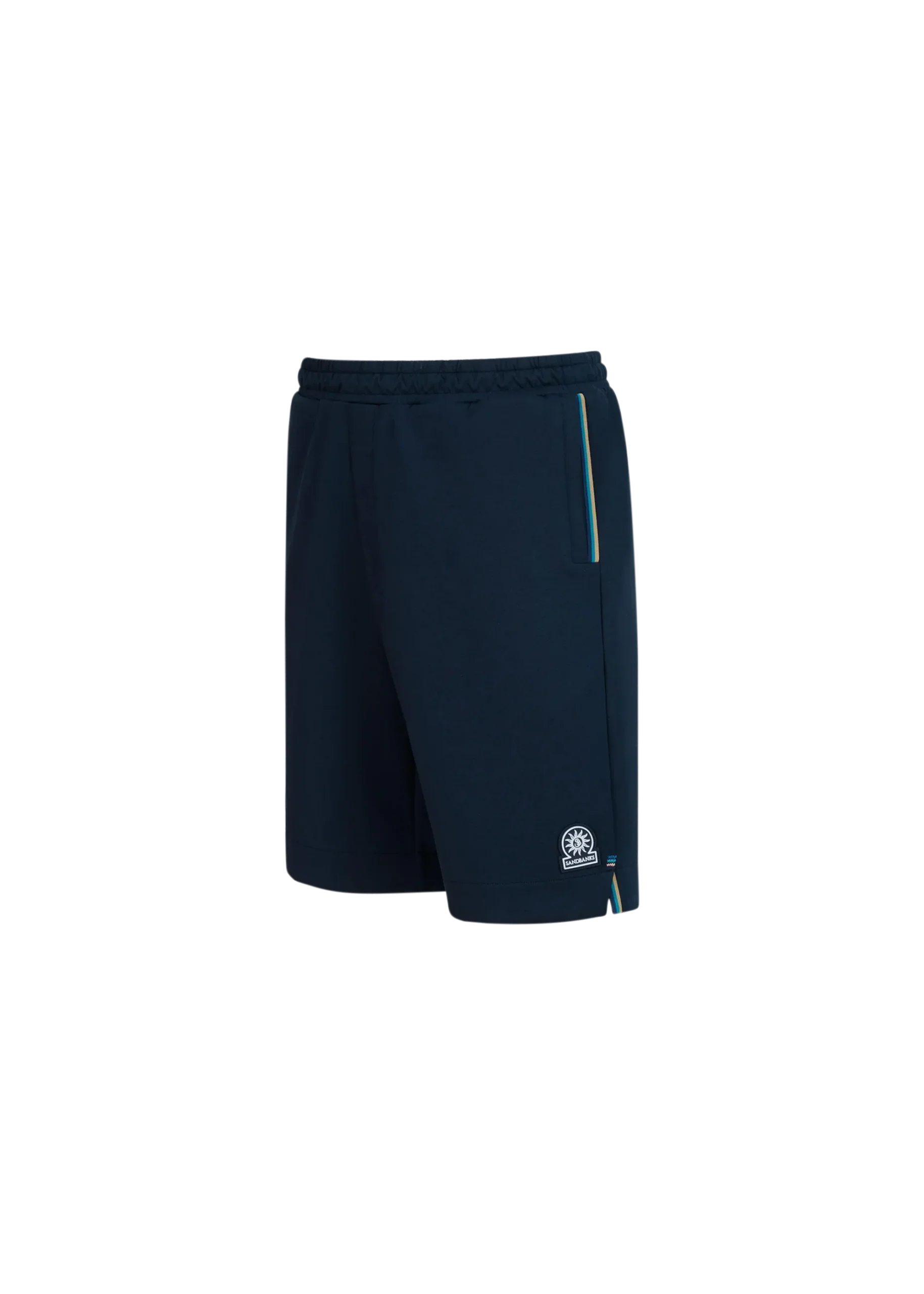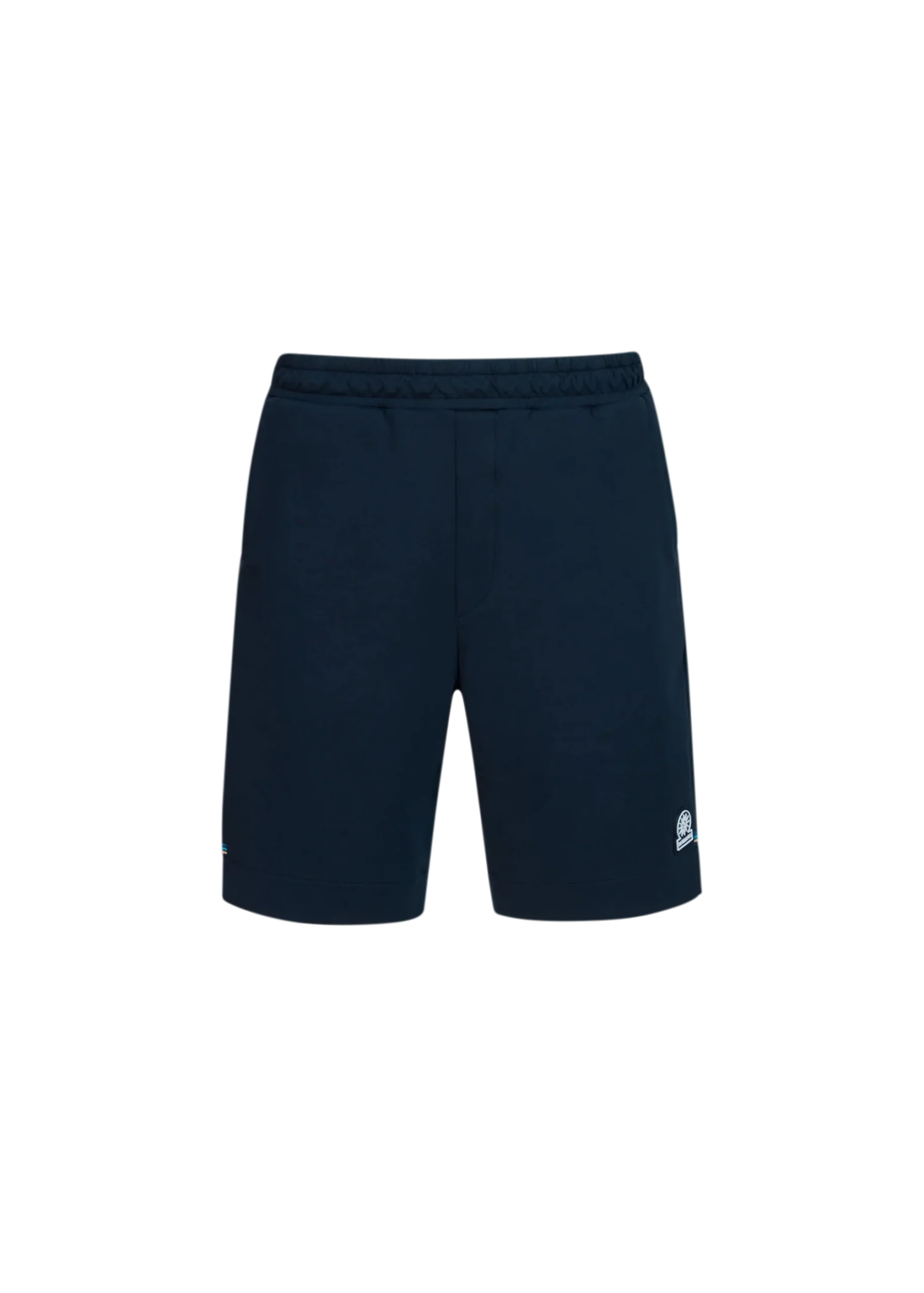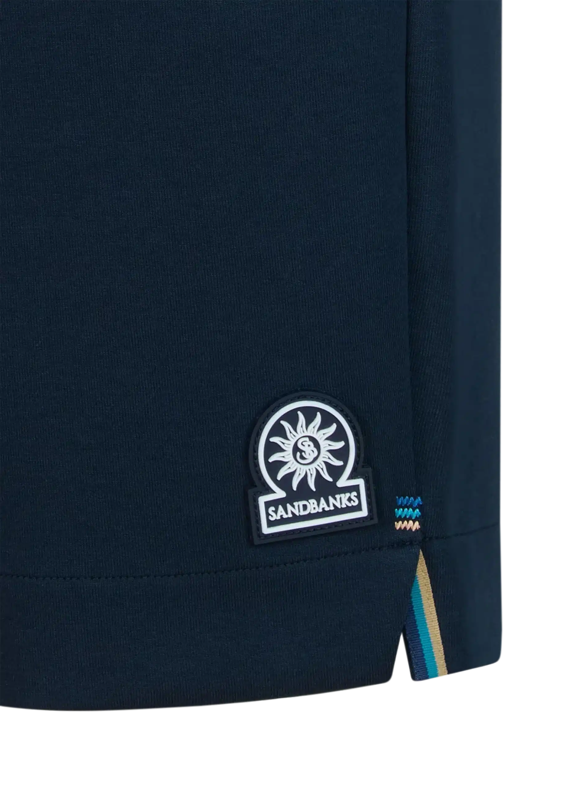 Sandbanks men’s badge logo interlock shorts in navy. This classic fitting garment is made from an interlock fabric for a superior smooth finish, featuring navy rubber badge with contrast white branding, and engraved gunmetal cord ends.