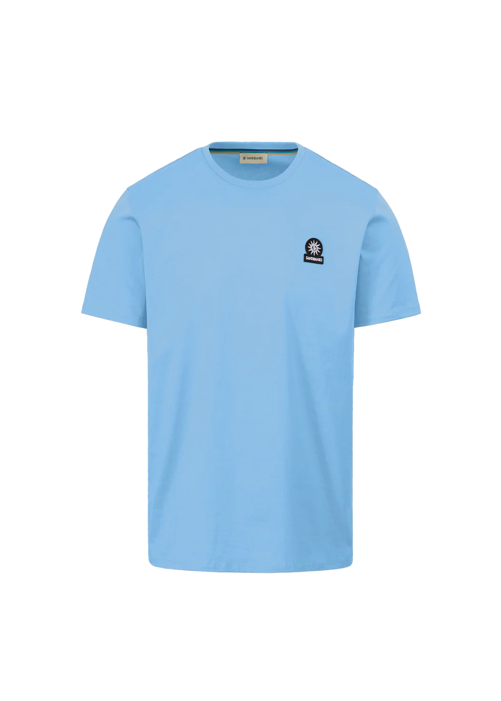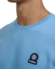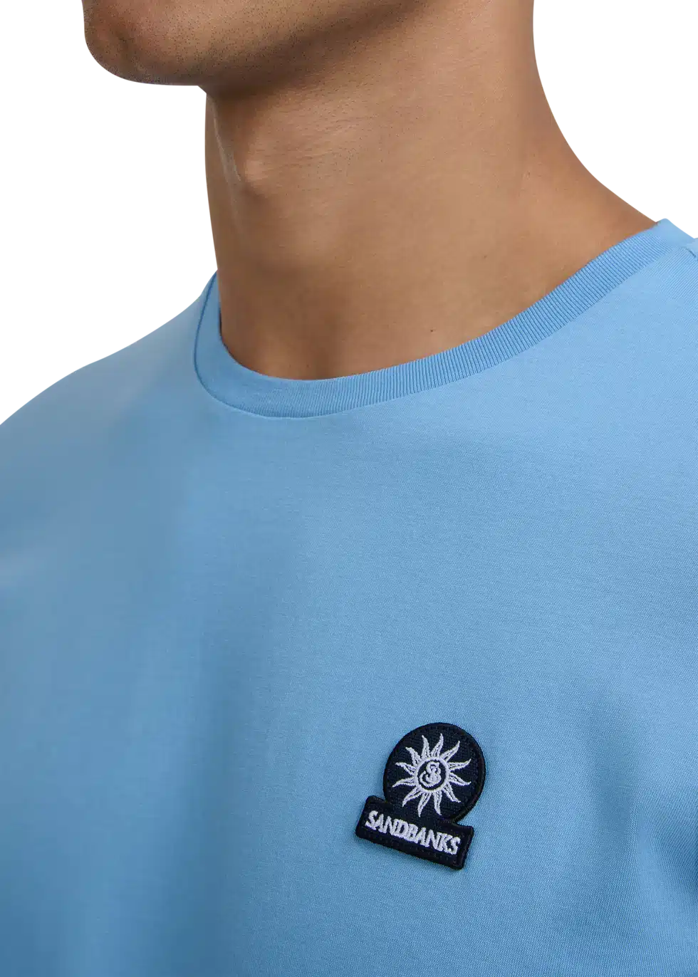 Sandbanks men’s badge logo t-shirt in dusty blue, made from mercerised cotton for a silky and luxurious feel. This classic fitting crew neck t-shirt features an embroidered badge logo on the chest and tri-colour back neck binding.