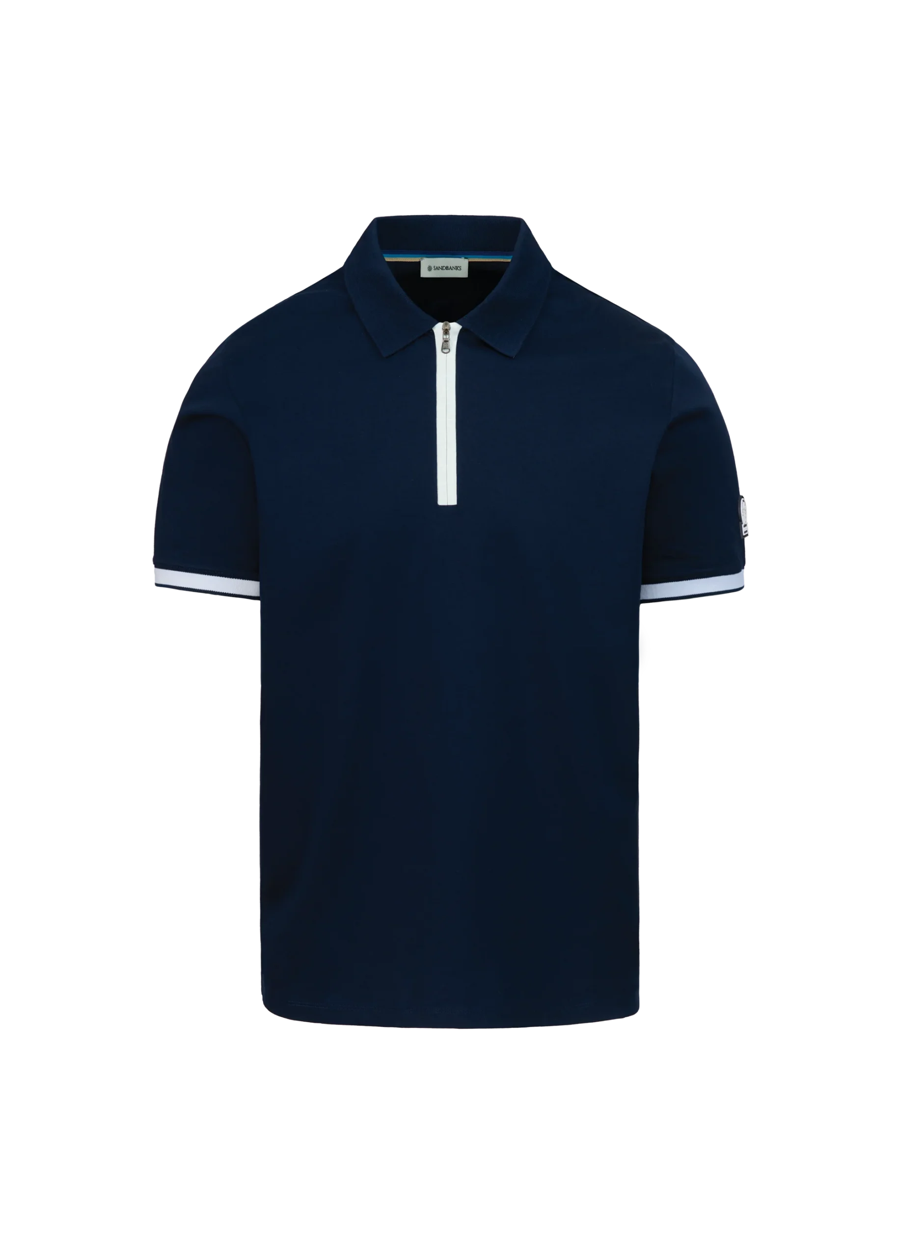 Sandbanks men’s silicone zip polo shirt in stone, made from 100% mercerised interlock cotton. This classic fitting polo shirt features a central Lampo silicone zip in black with tonal logo print, sandbanks rubber logo badge on sleeve, black striped knitted cuffs and tri-colour back neck binding.