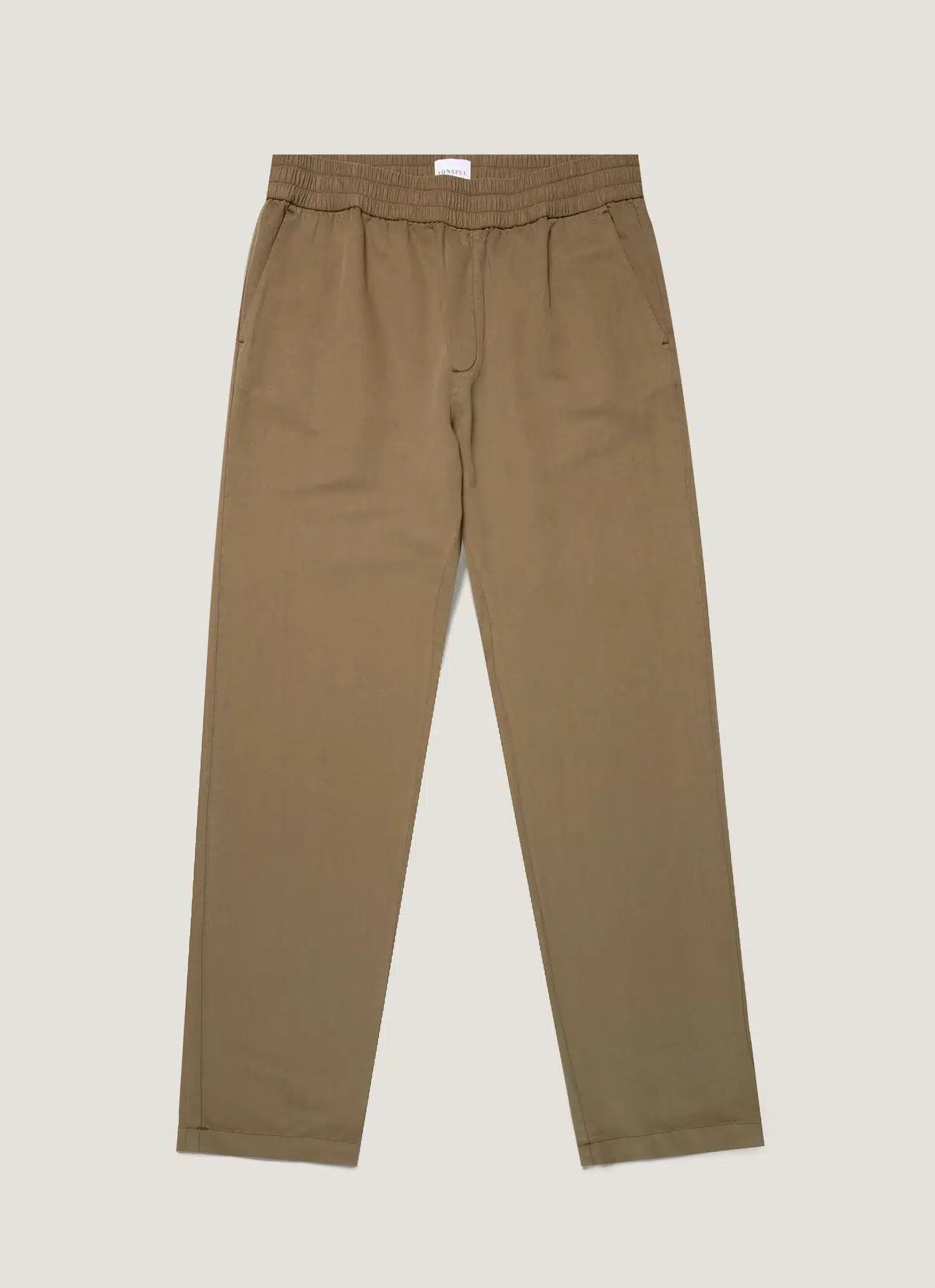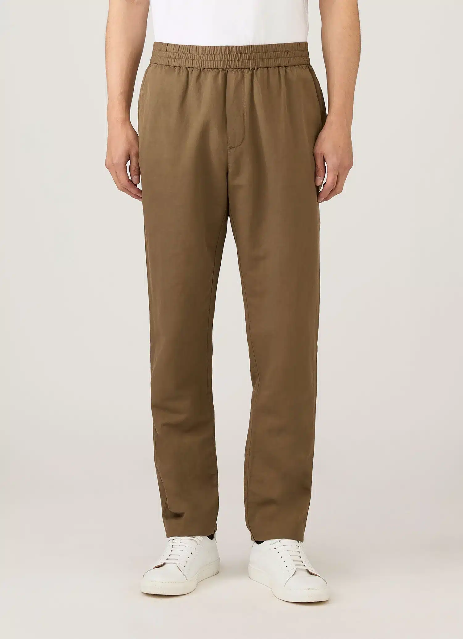 These drawstring trousers are crafted from a French cotton-linen blend that offers the softness of cotton and the casual look and breathability of linen. Mid to low rise, with a straight leg and drawstring.
